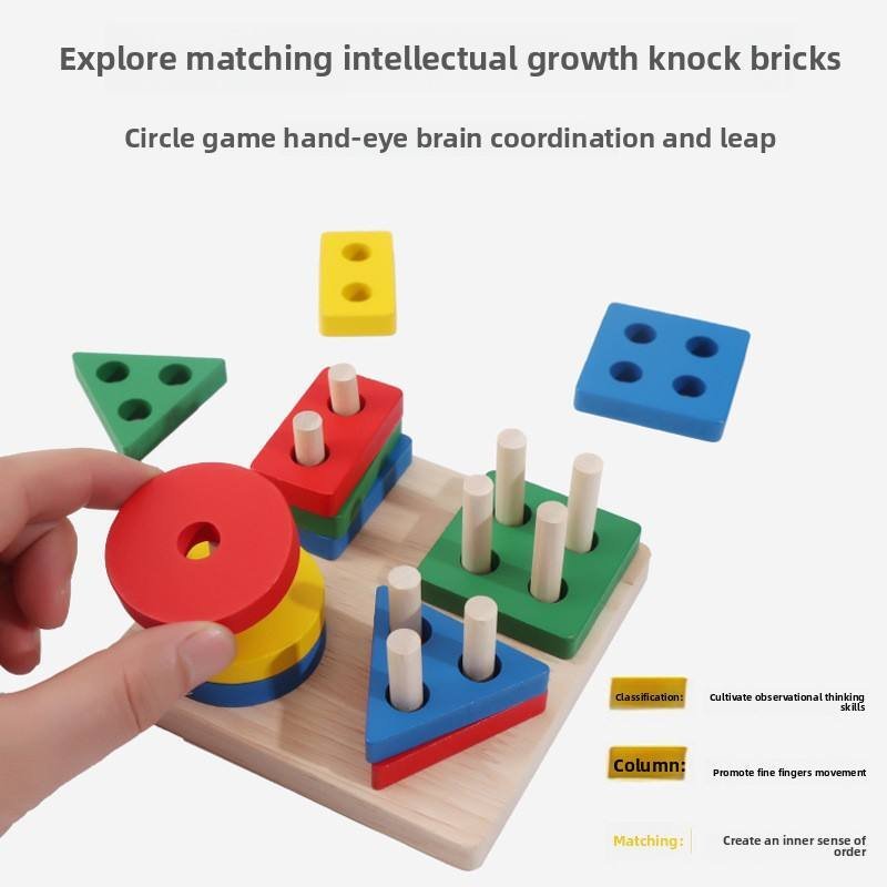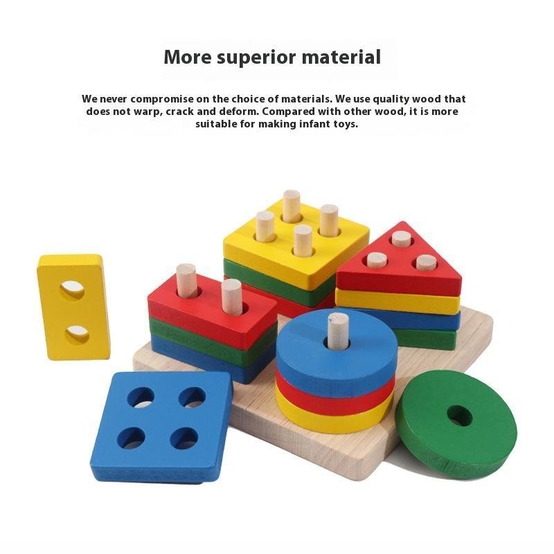Montessori wooden stacking puzzle board with geometric shape sorter. Fun, safe, and educational toy that boosts motor skills, learning, and problem-solving for kids 2+.